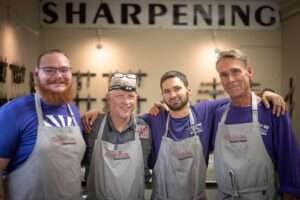 - Knives are sharpened using a custom, digital speed controlled system that allows us to achieve consistent, razor-sharp cutting edges, then polished using a leather stropping belt.