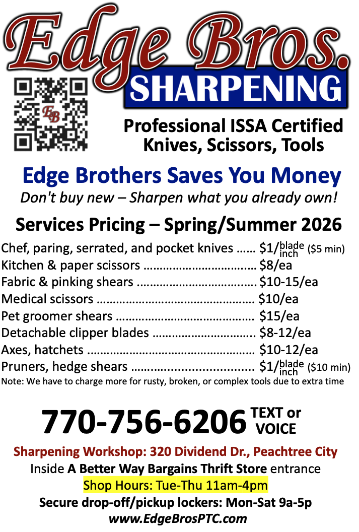 Edge Brothers in Peachtree City, GA brings razor-sharp precision to your blades. From grooming shears to clipper blades and kitchen knives, our professional sharpening service revitalizes dull edges, ensuring a clean cut every time. We also repair knife tips/edges, groomer shears, clippers (Andis, Heiniger, Wahl, Oster), and dog dryers (ECC K-9 and Double K).